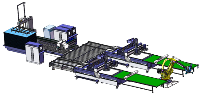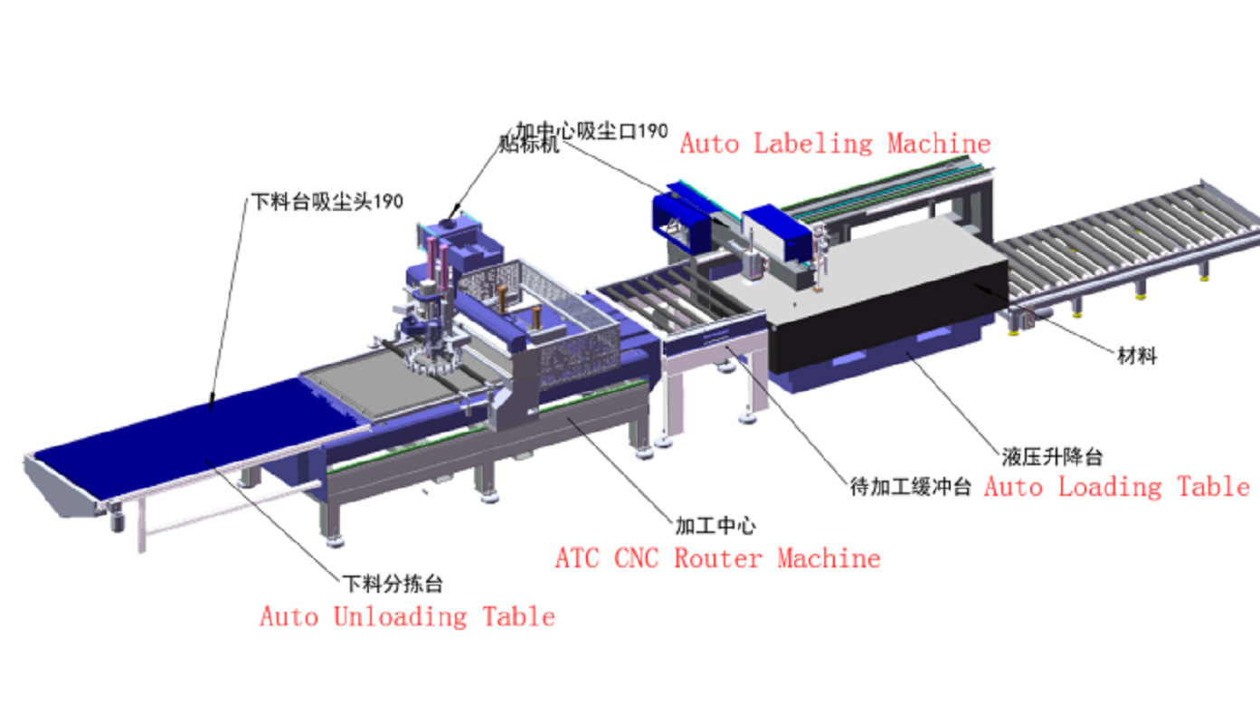 公司的一拖三柜體生產(chǎn)線生產(chǎn)線,包括板材供料系統(tǒng)、板面加工系統(tǒng)、板材輸送系統(tǒng)、板材加工系統(tǒng)、成品下料系統(tǒng)。該生產(chǎn)線一臺(tái)貼標(biāo)機(jī)可服務(wù)三臺(tái)加工中心開料,所有設(shè)備不間斷加工,最大化提高生產(chǎn)效率,且僅需一人操作。一天可加工約500-600張大板。